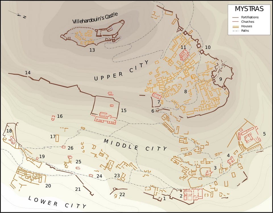 Plan of Mystras after works by G. Millet (1910) and M. Chatzidakis (1981) from Wikipedia